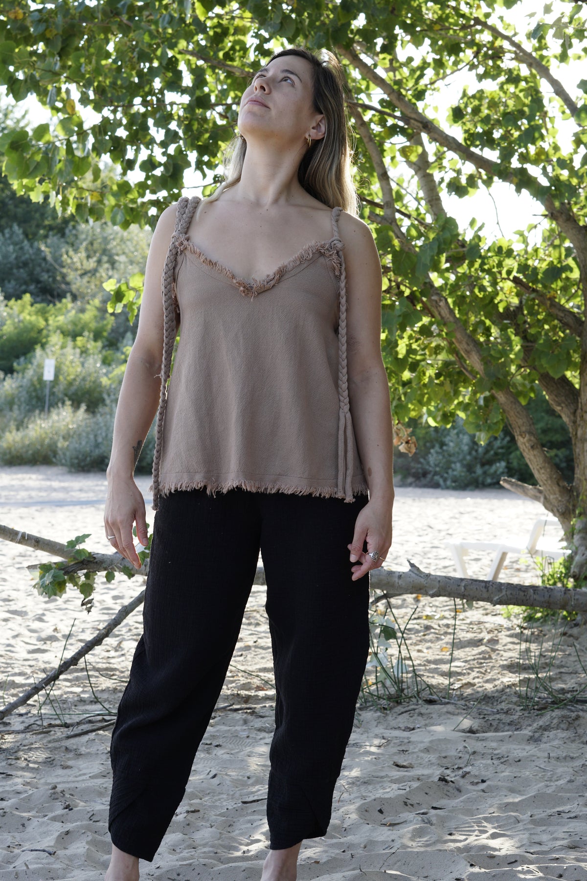 One of the perks of these pants is their low-maintenance nature. With a fixed ruffled appearance, they emerge from the wash ready to wear, eliminating the need for ironing. Their soft colors and natural fabrics evoke a sense of tranquility, inspired by the hues of the Earth.