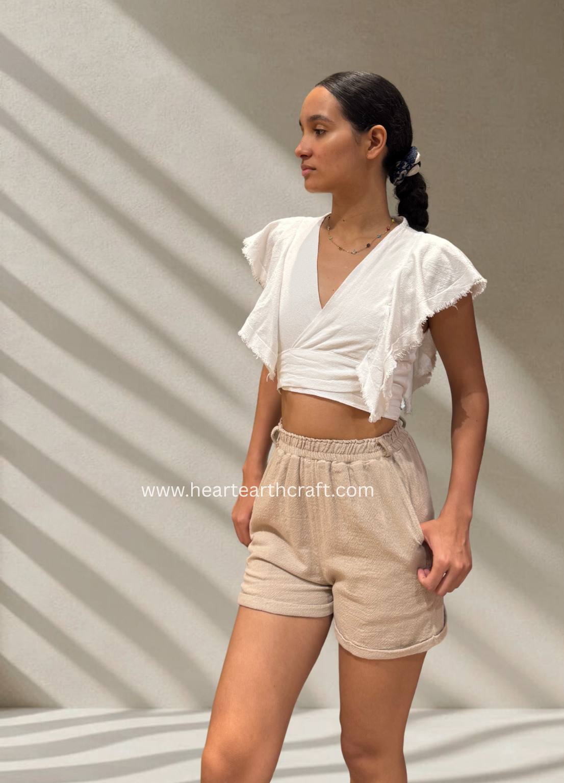 Flow effortlessly between earth and air in our Flutter Wrap Cotton Top, handcrafted from 100% natural cotton. Designed to embrace your feminine essence, this airy piece features soft, flowy sleeves with raw edges, adding a touch of bohemian grace to any look.