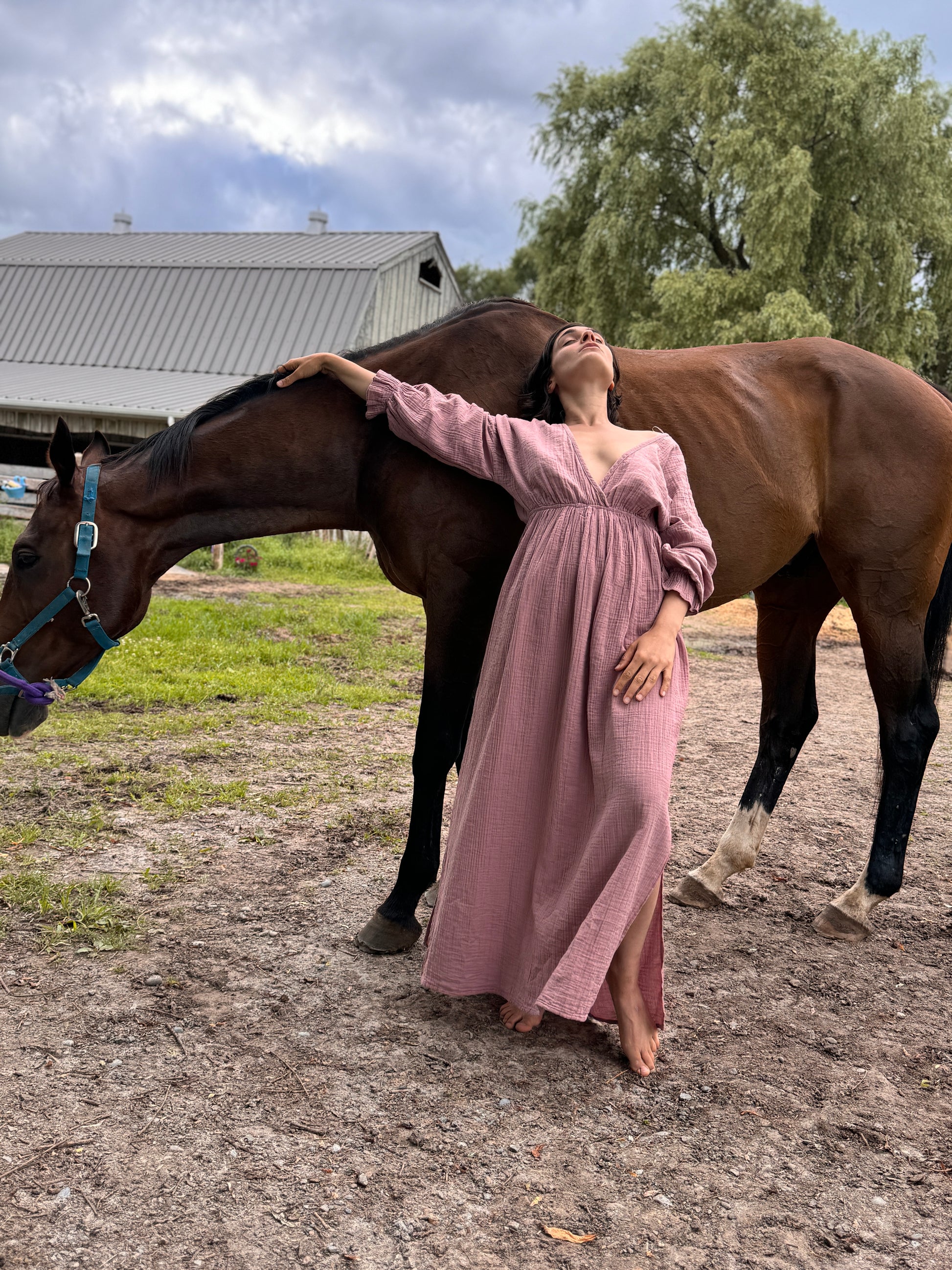 • I always find it helpful when people share measurements, so here are mine: 34” bust, 28” waist, 41” hips, 130 lbs, 5’4”. I got the S/M and it fits more like a Small, especially in the bust and arm holes. The length reaches the floor on me barefoot. The close-up photo shows the color more accurately. Beautiful dress, luxurious fabric and great design. I can’t wait to wear it all spring and summer!